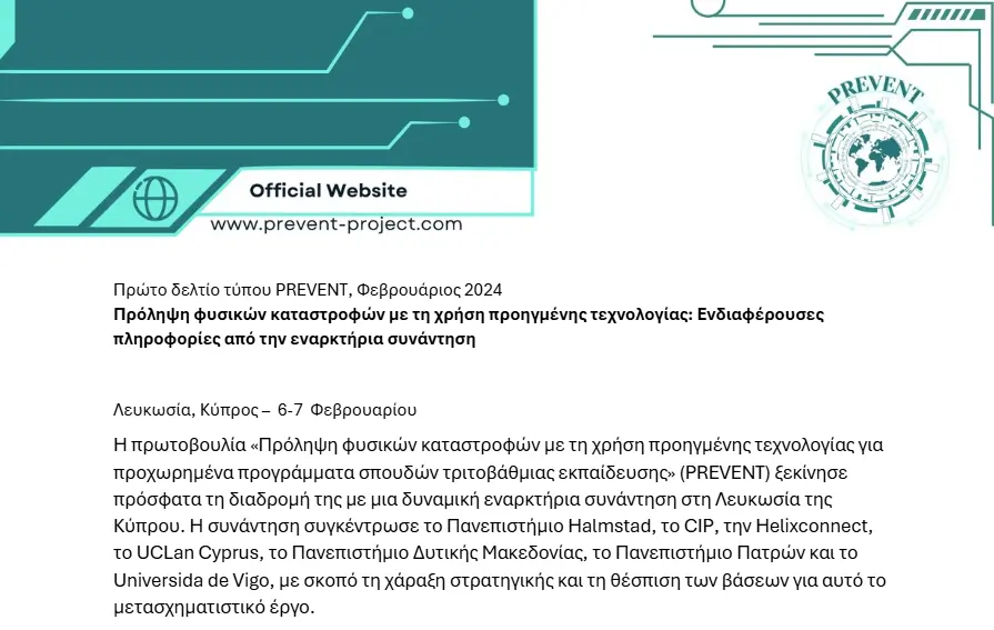 Δελτία Τύπου Άρθρα στο ιστολόγιο Συνεργασία χωρίς όρια! Η διεθνής ομάδα του προγράμματος prevent και το όνειρό μας για το μέλλον!7 Νοεμβρίου, 2025Read More Γνωρίστε τον συνεργάτη μας, το Πανεπιστήμιο Πατρών23 Μαΐου, 2025Read More Γνωρίστε τον συνεργάτη μας στο UCLan Κύπρου17 Απριλίου, 2025Read More Γνωρίστε τον συνεργάτη μας από το Πανεπιστήμιο της Βίγο3 Απριλίου, 2025Read More Γνωρίστε τον συνεργάτη μας από το Πανεπιστήμιο Δυτικής Μακεδονίας (UoWM)2 Μαΐου, 2025Read More Γνωρίστε τον συνεργάτη μας από το Πανεπιστήμιο Δυτικής Μακεδονίας (UoWM)9 Μαΐου, 2025Read More Γνωρίστε τον συνεργάτη μας από το Πανεπιστήμιο Δυτικής Μακεδονίας (UoWM)16 Μαΐου, 2025Read More Γνωρίστε τον συνεργάτη μας Helixconnect Europe10 Απριλίου, 2025Read More Γιατί η ανθεκτικότητα στο κλίμα ξεκινά από την τριτοβάθμια εκπαίδευση7 Νοεμβρίου, 2025Read More Αξιοποίηση των τεχνολογιών Deep Technologies για την πρόληψη φυσικών καταστροφών: Μια μετασχηματιστική προσέγγιση27 Μαρτίου, 2025Read More Faceți cunoștință cu partenerul nostru, Universitatea din Patras24 Απριλίου, 2025Read More Ενημερωτικά δελτία